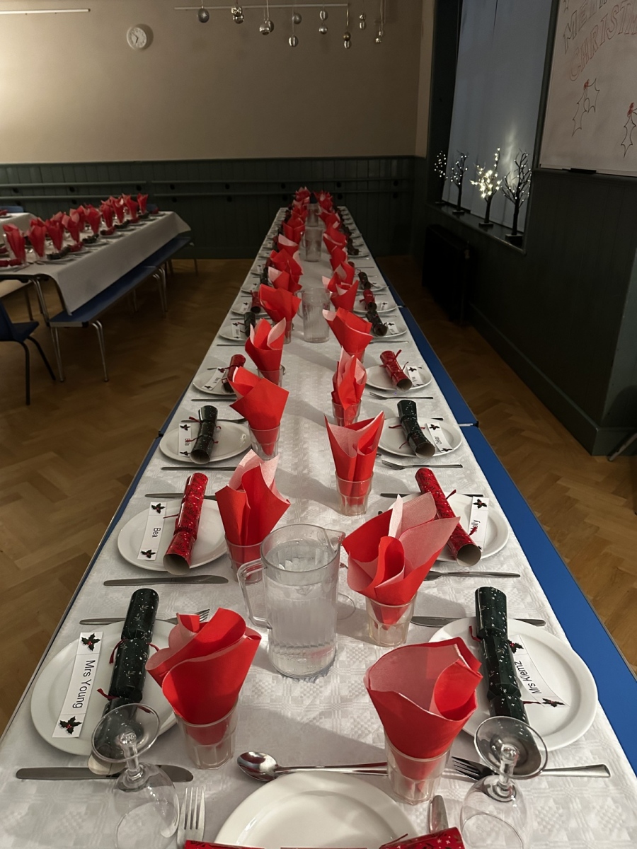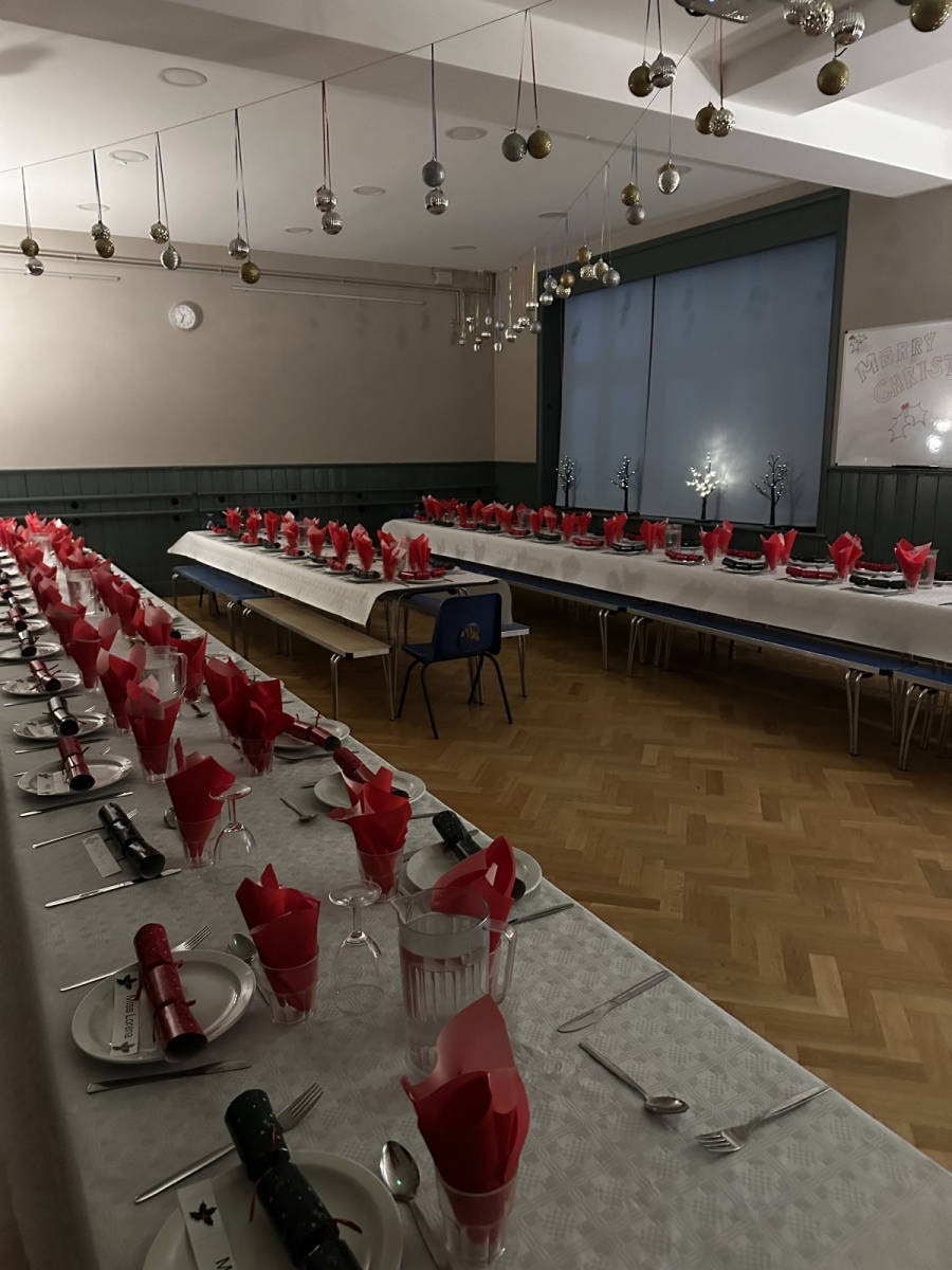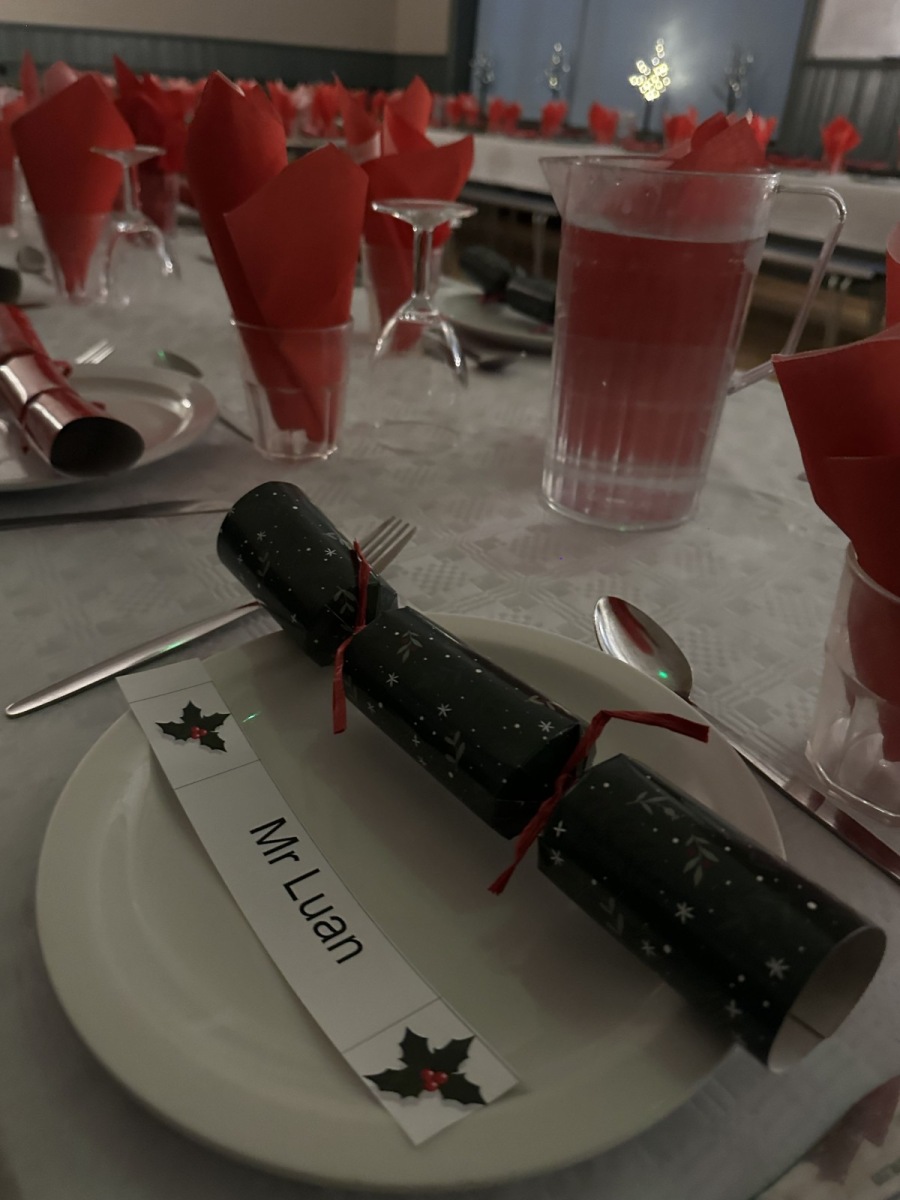 Everyone then made their way to the beautifully decorated FOSM for a traditional Christmas meal. Our wonderful catering team once again outdid themselves, serving a delicious feast complete with crackers, jokes, and plenty of laughter around the tables.